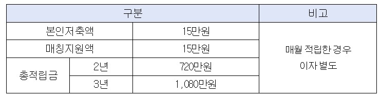 - 월 15만원을 2년 또는 3년간 저축 시 , 본인저축액과 동일한 적립 및 지원해 주는 적금