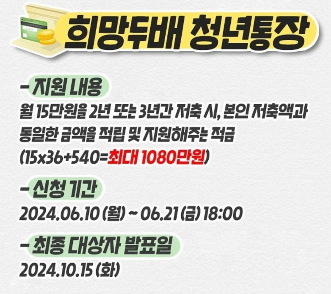 대한민국 청년여러분 이번 기회 놓치지 마시고 꼭 희망 두 배 청년통장 신청 하시기 바랍니다.